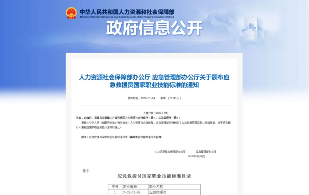 ⭐️2019年1月14日,人力資源社會保障部辦公廳、應(yīng)急管理部辦公廳頒布了《應(yīng)急救援員國家職業(yè)技能標準(2019版)》,“應(yīng)急救援員”(職業(yè)編碼:3-02-03-08)取代“緊急救助員”正式成為國家職業(yè)技能標準之一。