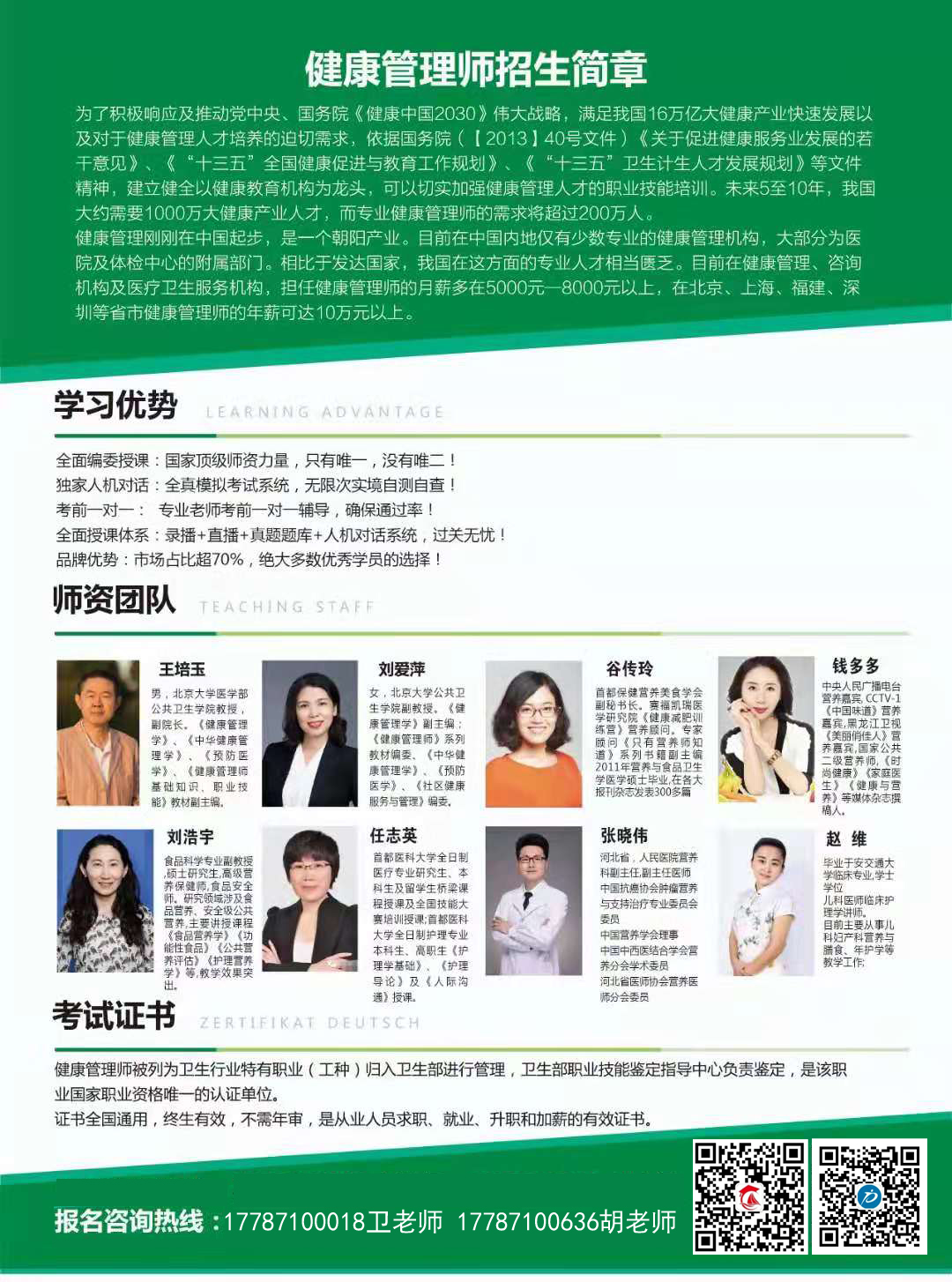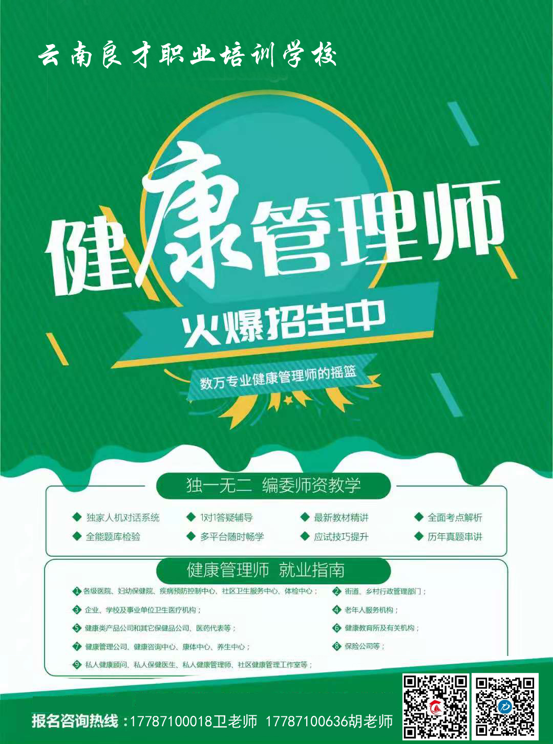以上就是關于“高級健康管理師培訓考證”的全部介紹,我校提供:三項崗位人員培訓項目、特種設備培訓項目、安全培訓合格證(非高危)、職業技能培訓和職業技能評價。如果你想具體了解和報考,請聯系云南良才職業培訓學校,聯系人:衛老師,電話(微信):17787100018 (點擊電話直接撥打)